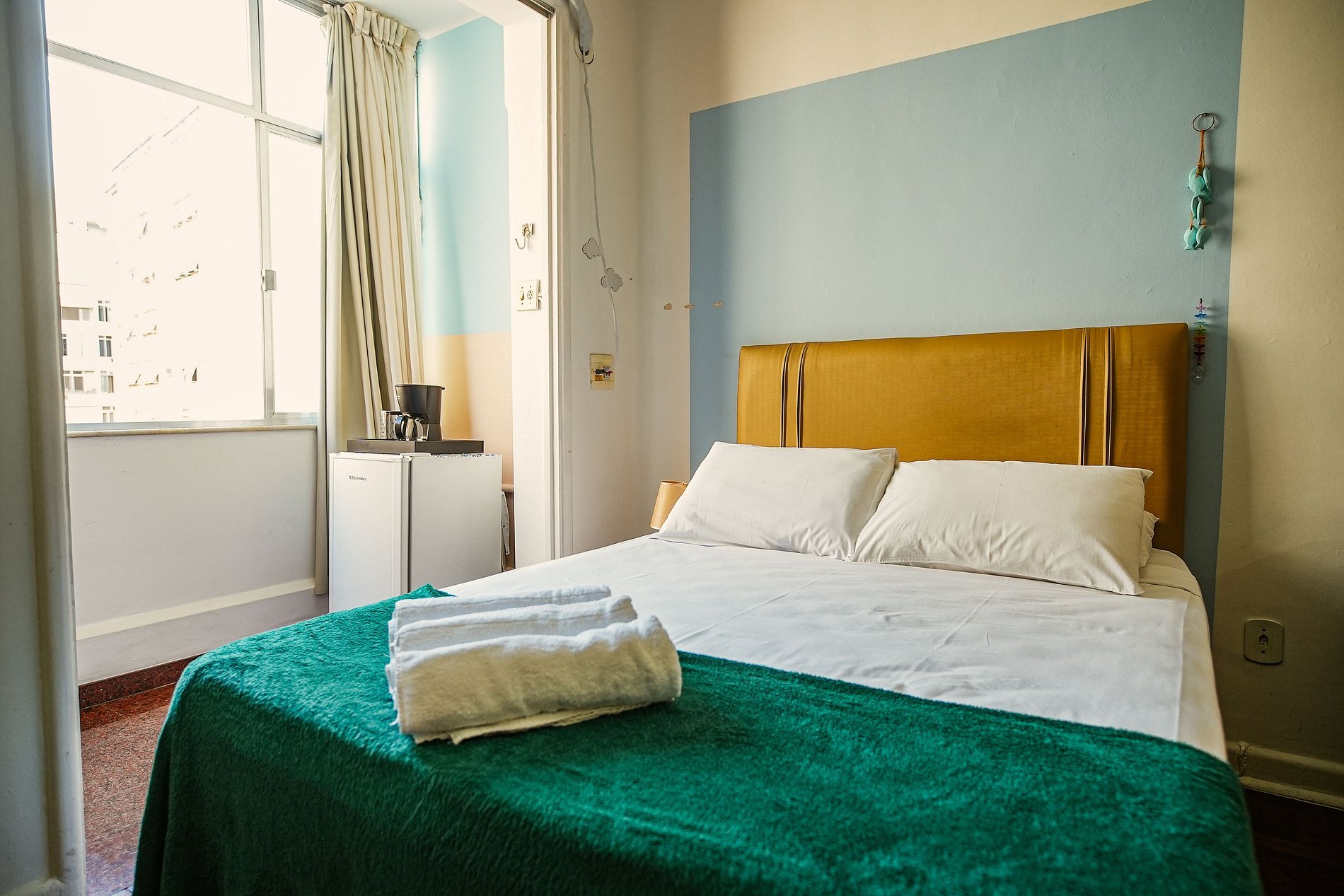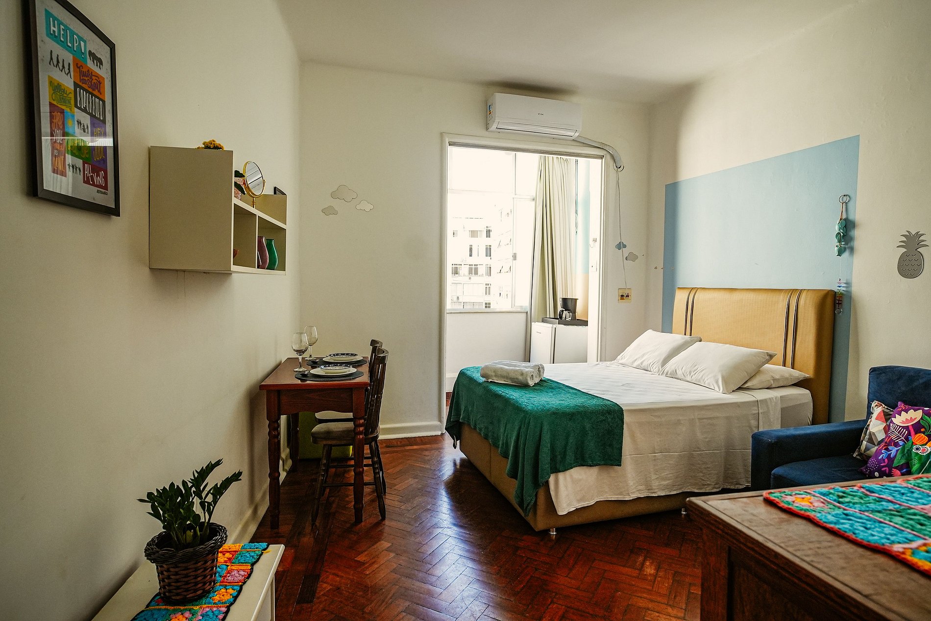 Conta com ar-condicionado, frigobar, banheiro e cozinha equipada com itens básicos, ideais para sua estadia em Copacabana.