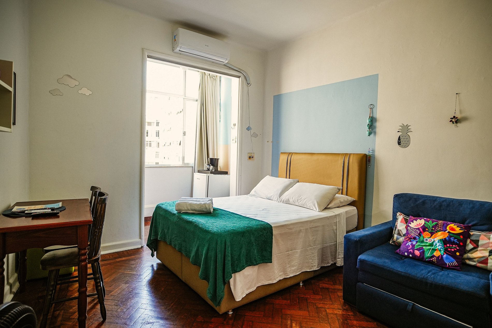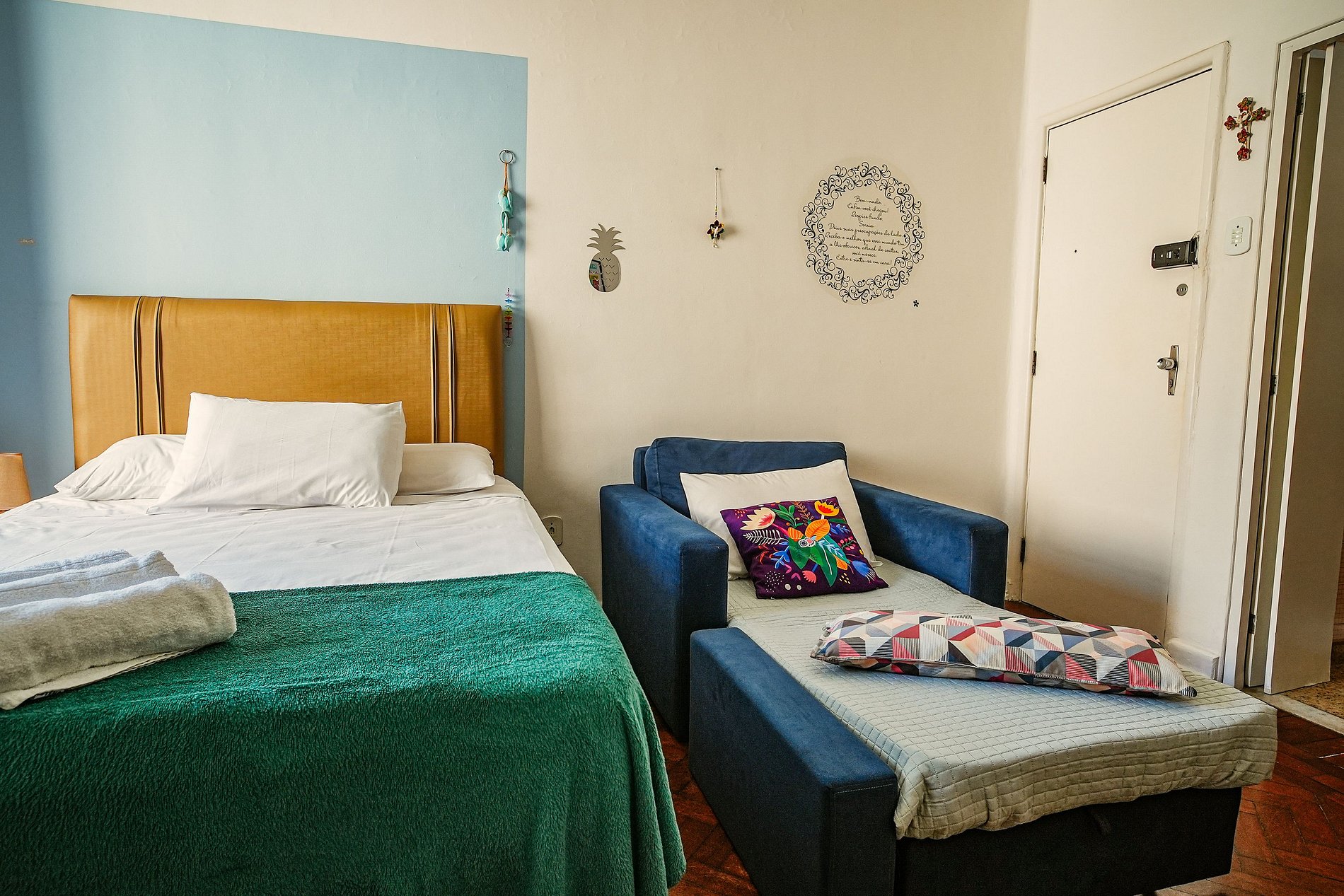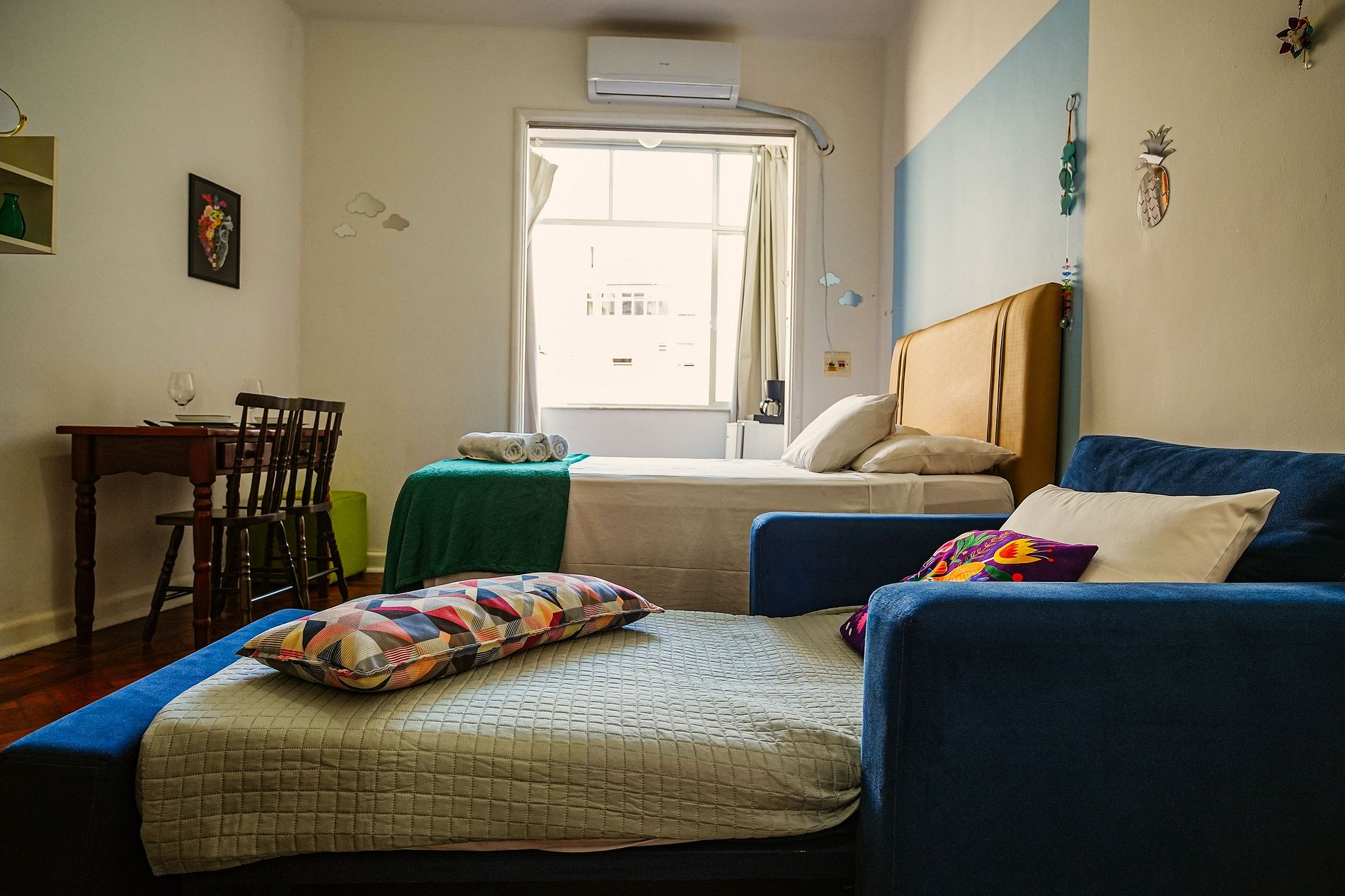 O apartamento é aconchegante, com cama de casal confortável e sofá-cama individual para um terceiro hóspede.