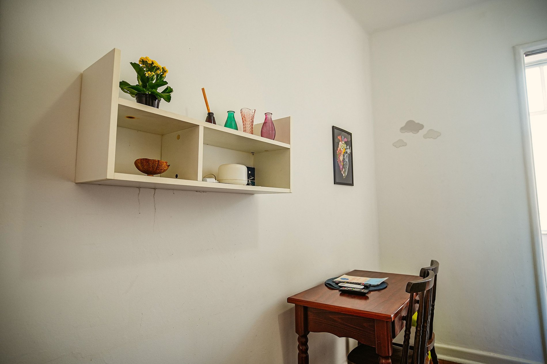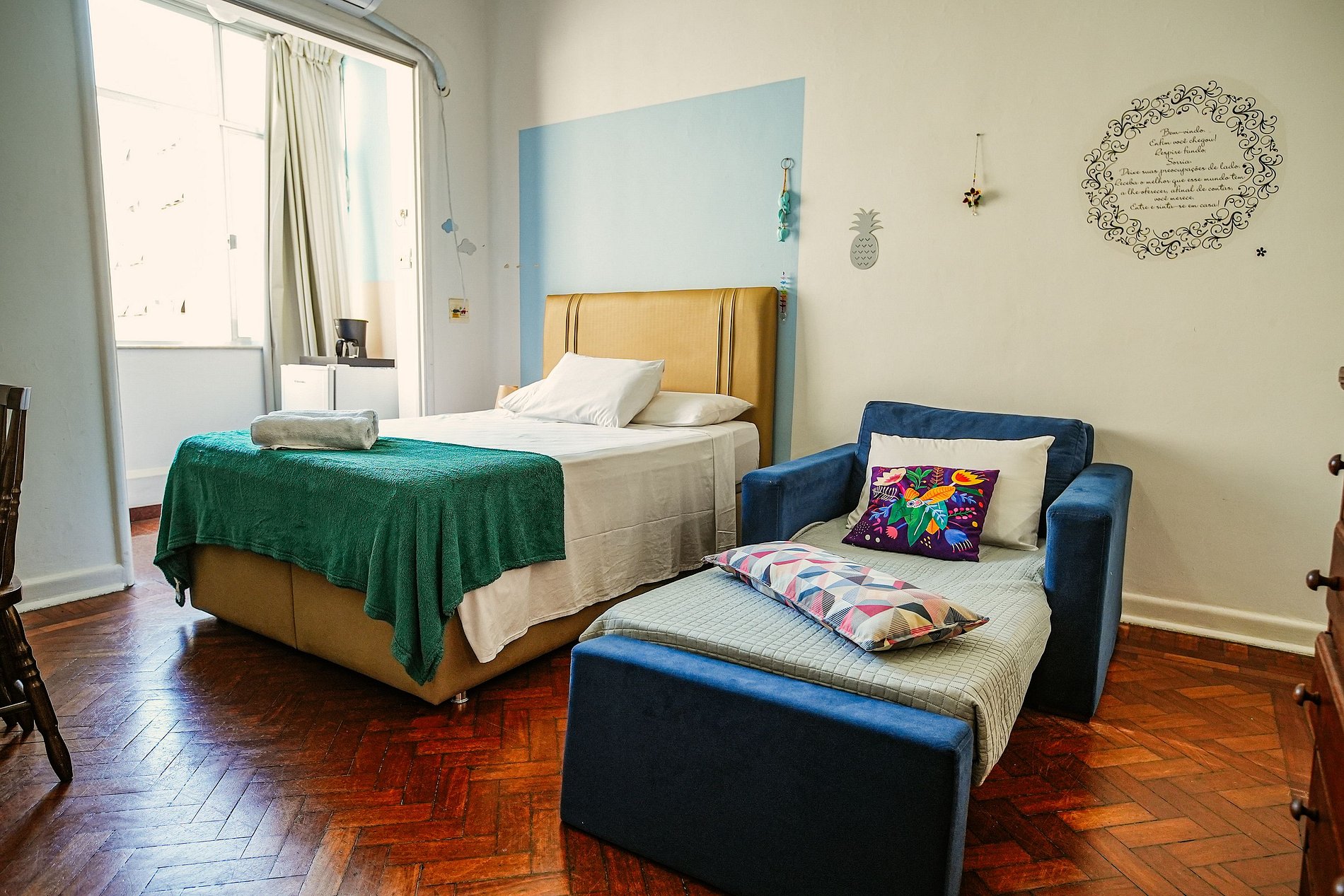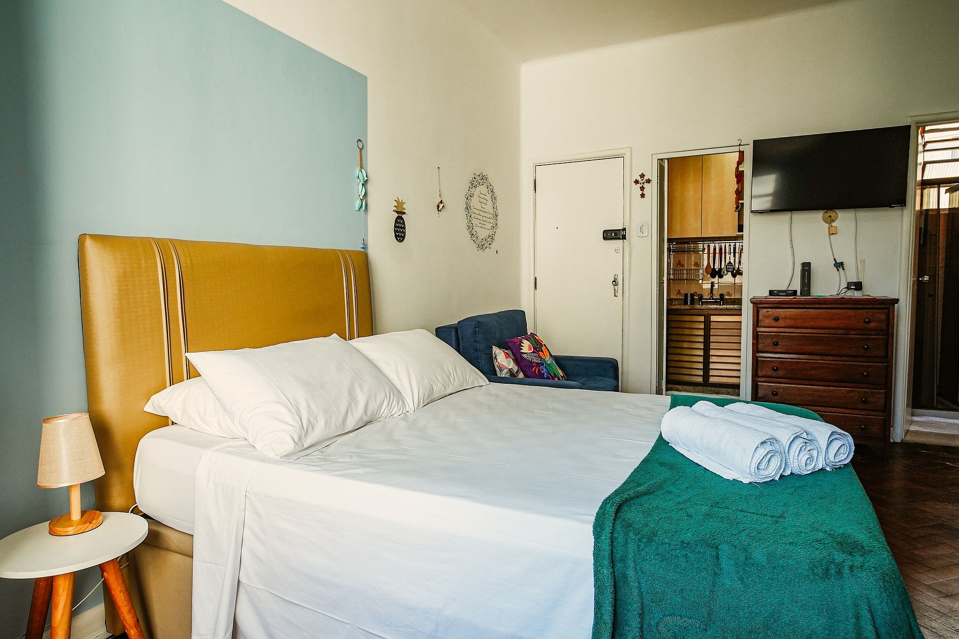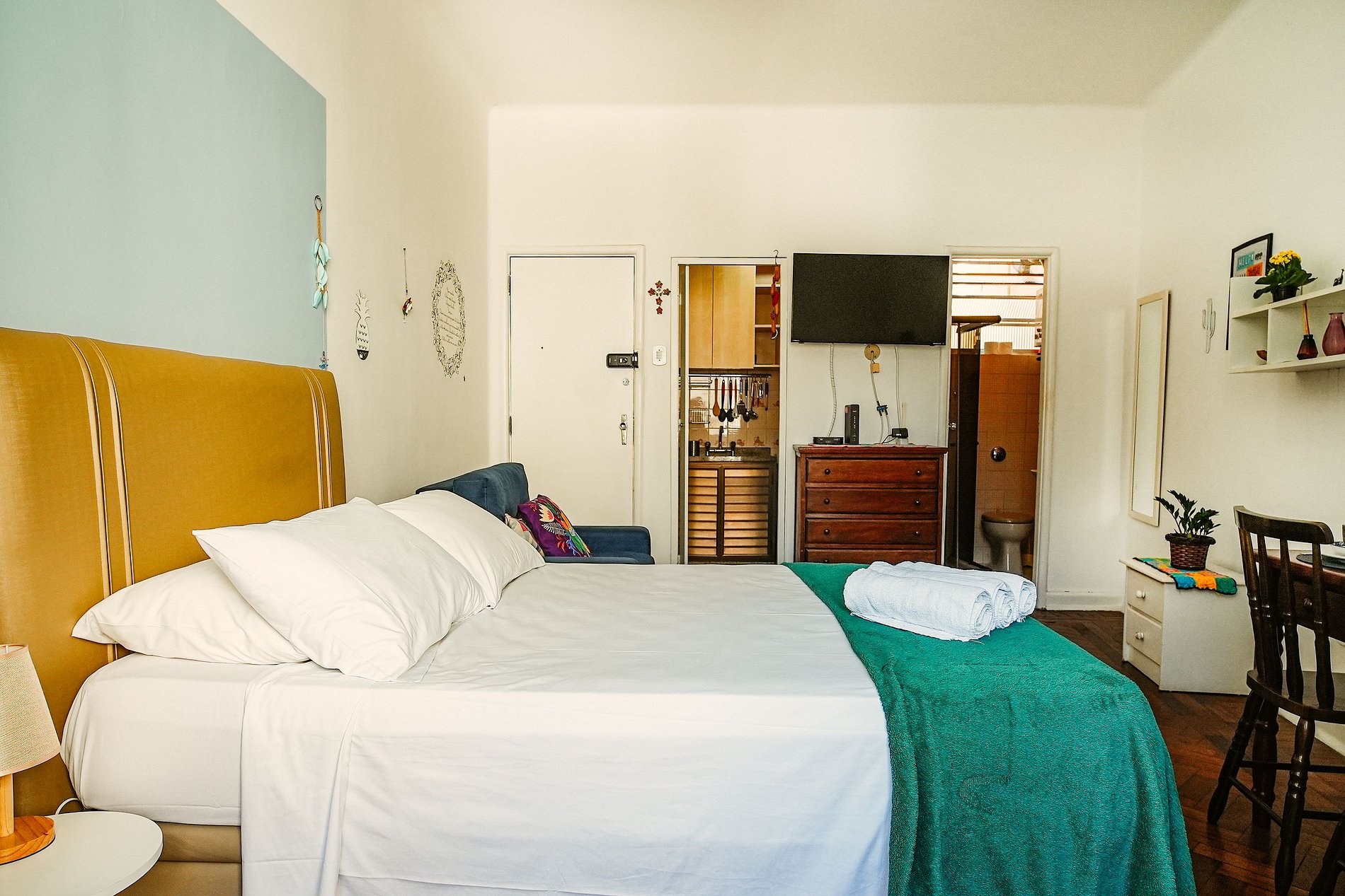 O apartamento é aconchegante, com cama de casal confortável e sofá-cama individual para um terceiro hóspede.